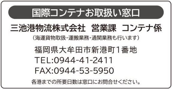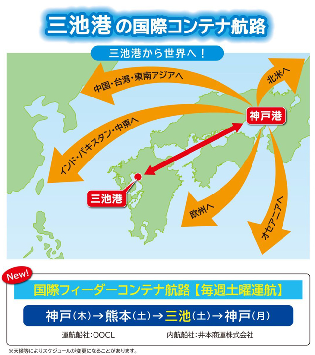 三池港から神戸経由で、中国・東南アジアをはじめ、北米、欧州などの各方面の国と輸出入が行えます。