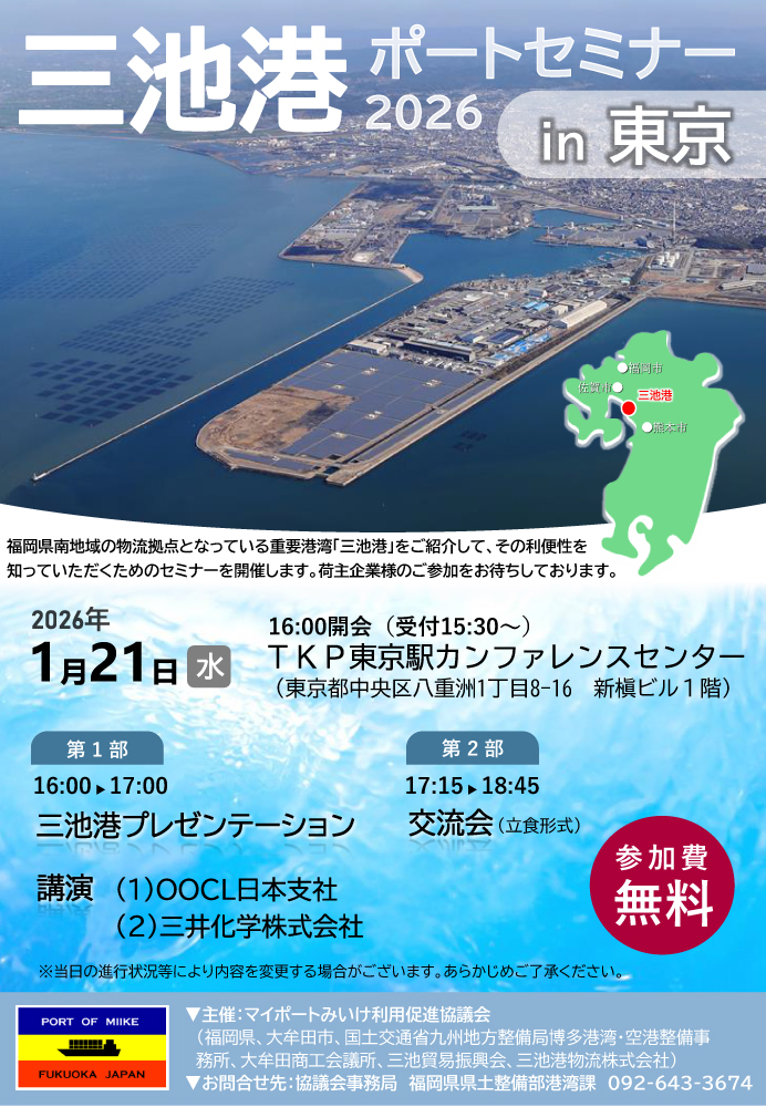 ≪日程≫ 令和8年(2026年)1月21日(水) ポートセミナー 16:00~17:00(受付15:30~) 交流会 17:15~18:45 ≪会場≫ TKP東京駅カンファレンスセンター (東京駅中央区八重洲1-8-16 新槇町ビル) ≪定員≫100名程度 ≪参加費≫無料 ≪チラシ≫ https://www.miikeport.jp/image/2025/seminar.pdf
